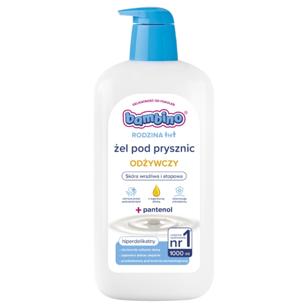 Bambino Rodzina odżywczy żel pod prysznic to łagodny kosmetyk pod prysznic i do kąpieli w wannie do codziennego stosowania. Zawiera legendarną oliwkę Bambino i pantenol. Skutecznie odżywia skórę i pomaga zapobiegać podrażnieniom.