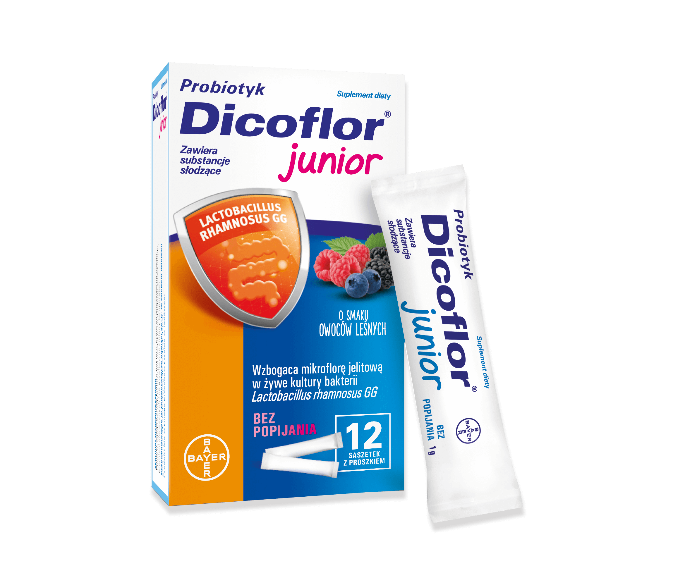 Dicoflor Junior Probiotyk Saszetki Dla Dzieci - 12 sasz. to suplement diety w formie wygodnych saszetek z proszkiem o smaku owoców leśnych, przeznaczony dla dzieci od 3. roku życia oraz dorosłych. Proszek zawiera liofilizowane, żywe kultury bakterii Lactobacillus rhamnosus GG (ATCC 53103), które mają potwierdzone klinicznie bezpieczeństwo stosowania. Dzięki specjalnej formule proszek szybko rozpuszcza się w ustach, co pozwala na łatwe podanie produktu bez konieczności popijania, dozując go bezpośrednio na język.