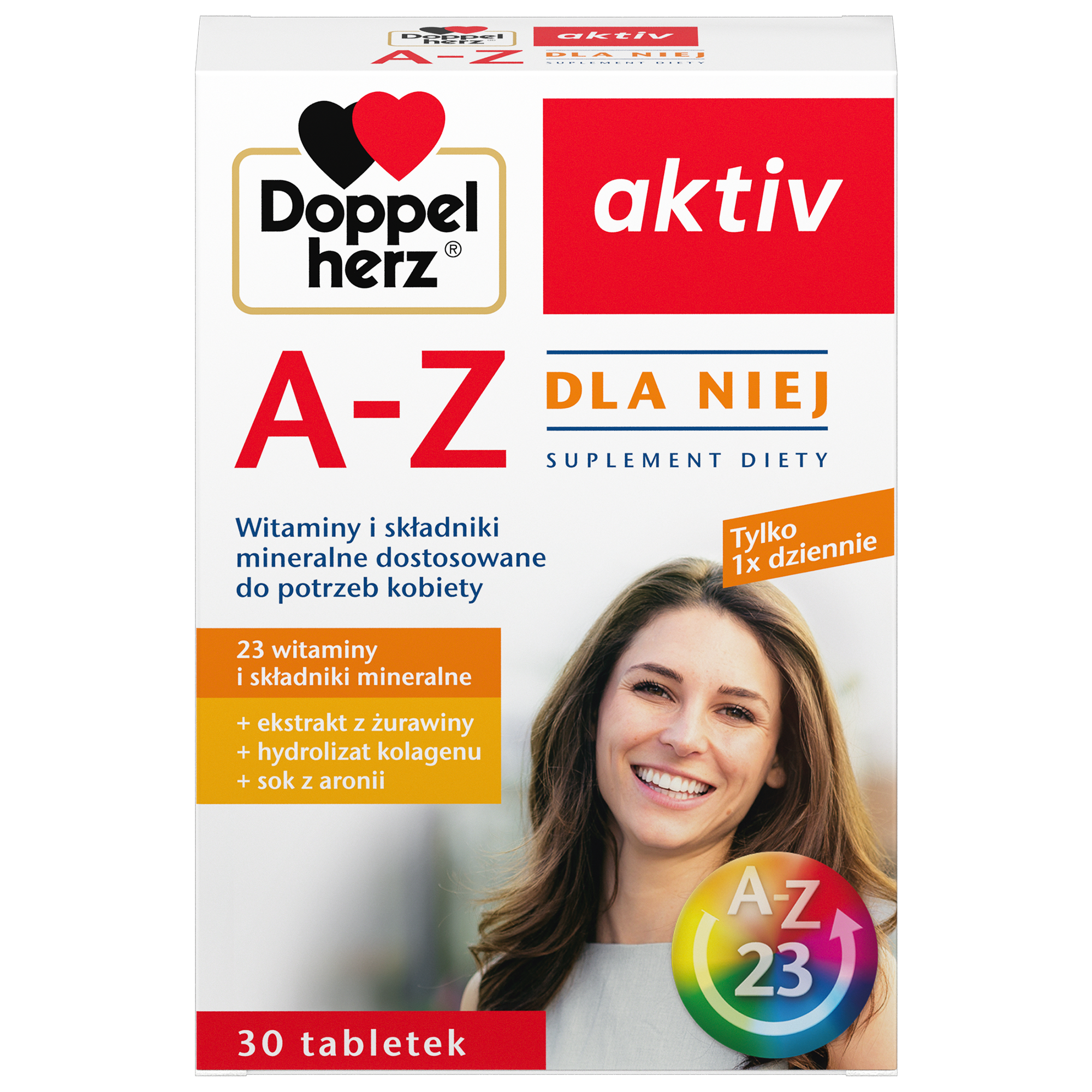 - Dzięki Doppelherz Aktiv A-Z Dla Niej zyskasz kompleksowe wsparcie dla Twojego organizmu, dopasowane do kobiecych potrzeb.