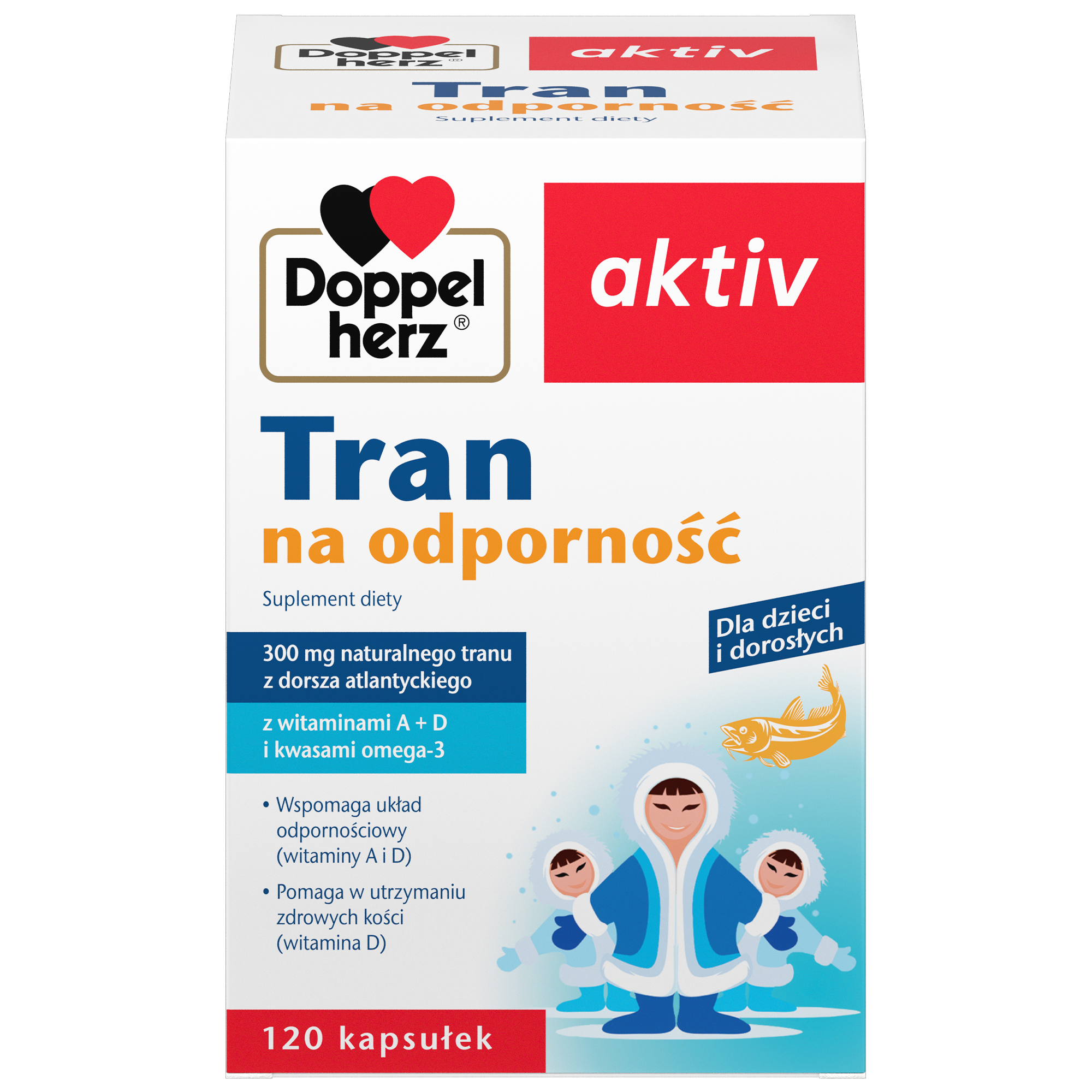 Suplement diety DOPPELHERZ AKTIV TRAN NA ODPORNOŚĆ Omega-3, Witaminy A+D to preparat opracowany z myślą o wsparciu układu immunologicznego zarówno u dzieci, jak i dorosłych. Produkt zawiera tran z dorsza atlantyckiego, który dostarcza niezbędnych kwasów tłuszczowych omega-3 oraz witamin rozpuszczalnych w tłuszczach A i D. Regularne stosowanie DOPPELHERZ AKTIV TRAN NA ODPORNOŚĆ pomaga utrzymać prawidłową odporność organizmu, zwłaszcza w okresie zwiększonego ryzyka infekcji, takim jak jesień i zima.