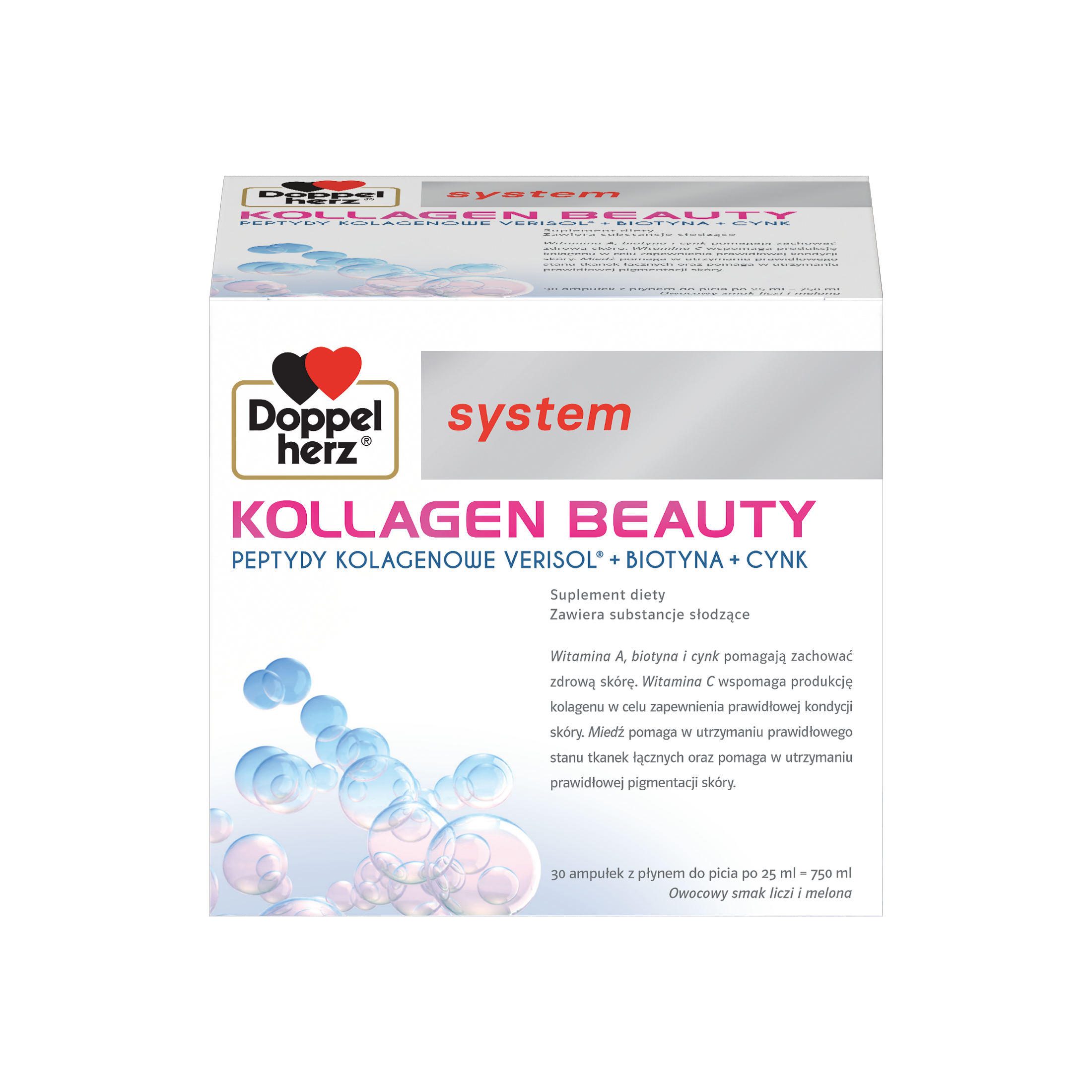 Doppelherz System KOLLAGEN Beauty Suplement Diety - 30 ampułek x 25ml to preparat stworzony z myślą o utrzymaniu zdrowej i zadbanej skóry, włosów oraz paznokci. Produkt zawiera kolagen VERISOL®, specjalnie opracowany typ kolagenu peptydowego, który wpływa na poprawę elastyczności skóry oraz wspiera jej regenerację od wewnątrz.