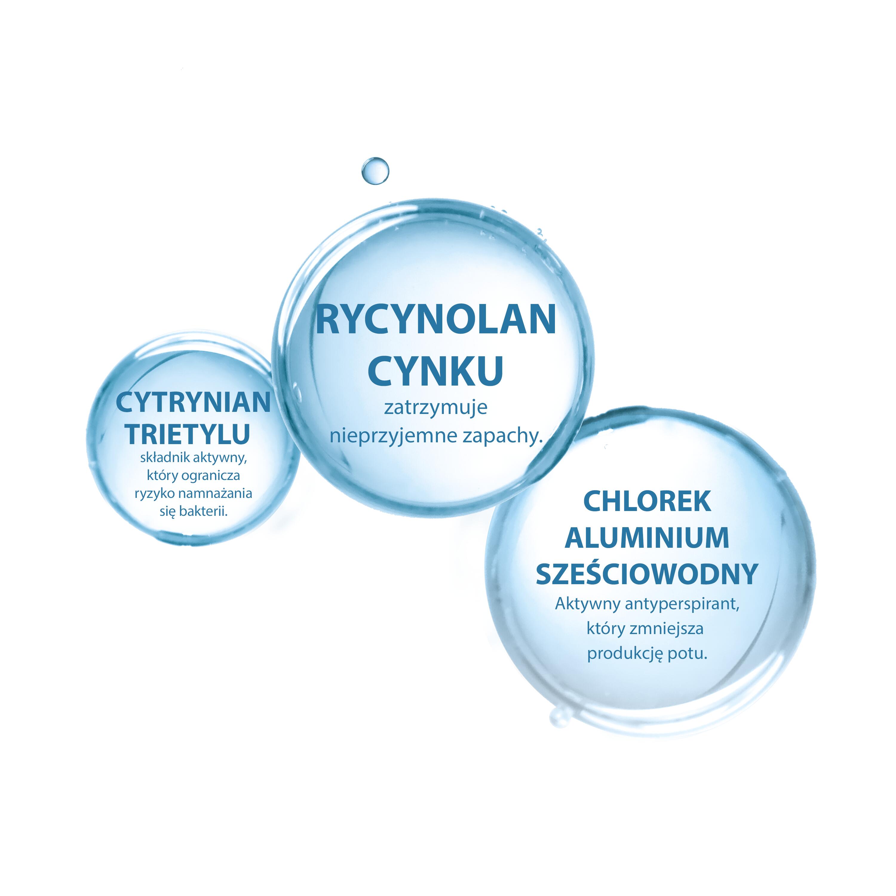 Neutralizacja zapachu – za pomocą cytrynianu trietylu oraz rycynoleinianu cynku, dezodorant redukuje rozwój bakterii odpowiedzialnych za nieprzyjemny zapach