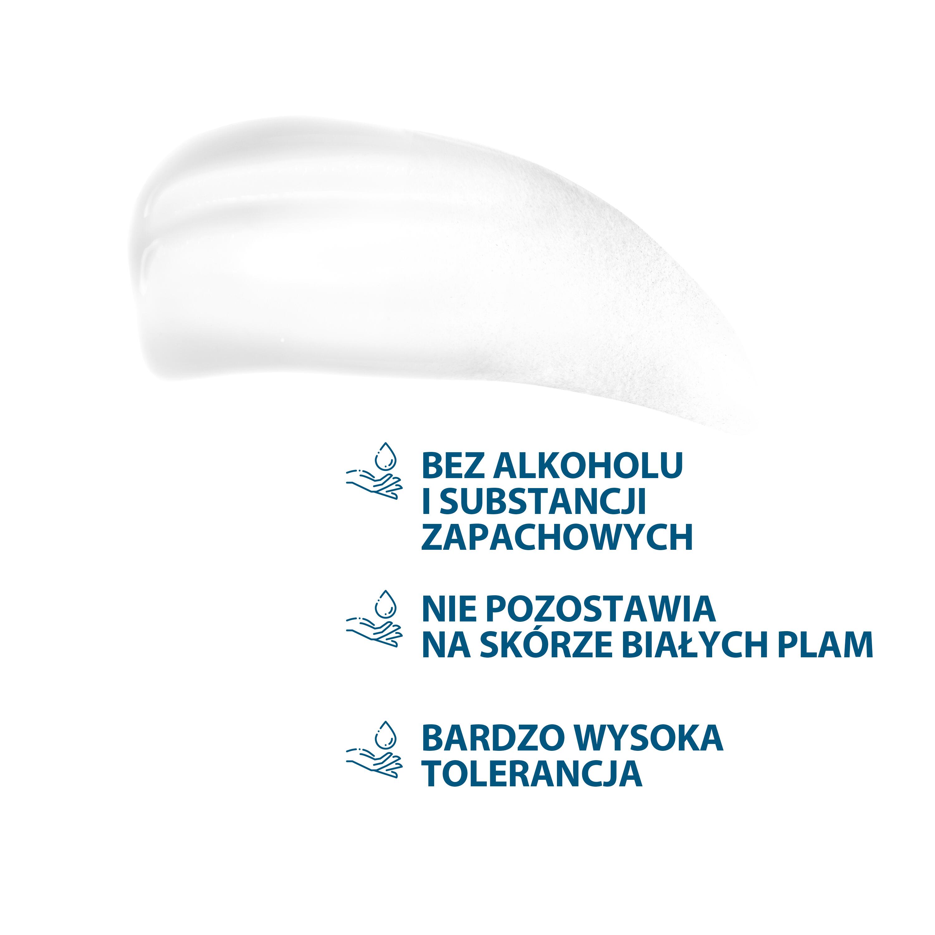 Ochrona i komfort skóry – formuła bez alkoholu, bezzapachowa, zawierająca olej z nasion słonecznika, skrobię ryżową i witaminę E