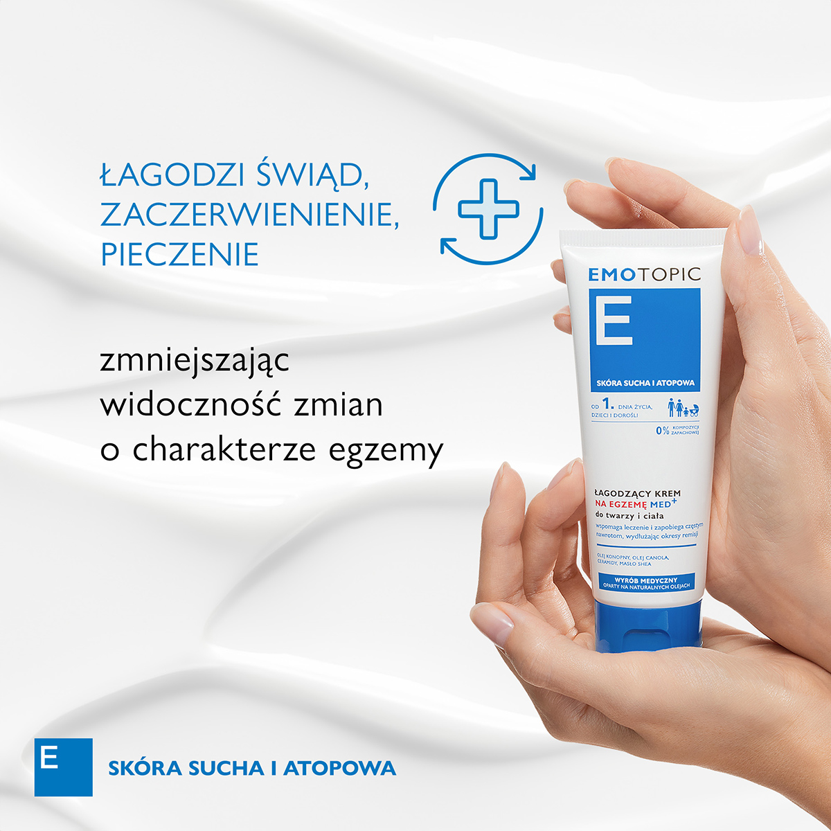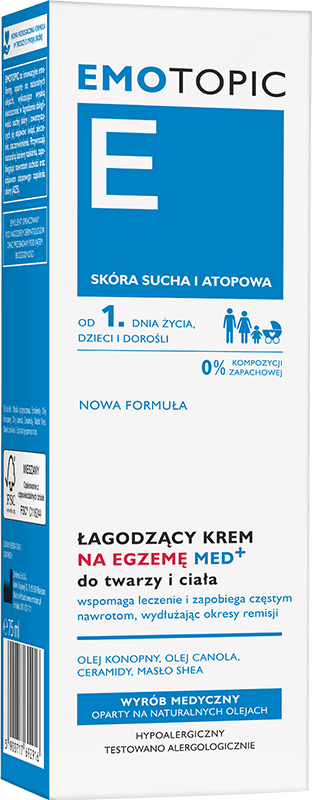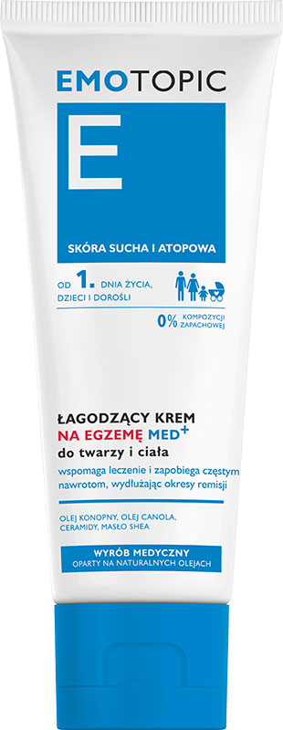 EMOTOPIC Łagodzący krem na egzemę MED+ to wyrób medyczny opracowany z myślą o pielęgnacji skóry z objawami egzemy – wyprysku kontaktowego, atopowego lub przewlekłej egzemy dłoni. Produkt skutecznie łagodzi zaczerwienienie, suchość, łuszczenie, a także pieczenie i świąd, jednocześnie wspierając odbudowę bariery hydrolipidowej skóry. Polecany do codziennego stosowania u dorosłych i dzieci, bez ograniczeń wiekowych.