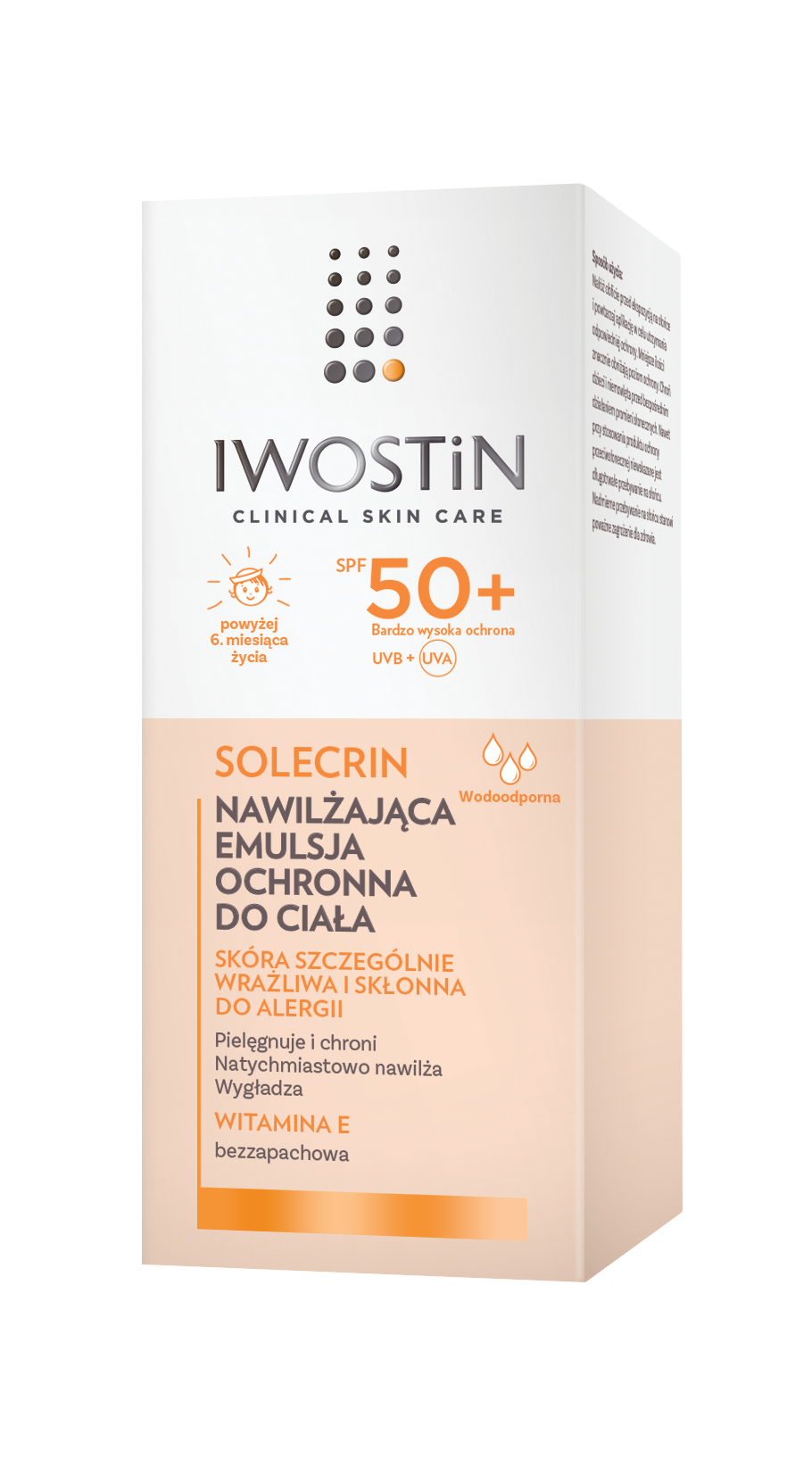 Iwostin Solecrin Nawilżająca Emulsja Ochronna Do Ciała SPF50+ to specjalistyczny produkt przeznaczony do ochrony skóry wrażliwej i skłonnej do alergii przed szkodliwym działaniem promieniowania słonecznego. Emulsja o pojemności 100 ml łączy bardzo wysoką ochronę przeciwsłoneczną z właściwościami nawilżającymi i ochronnymi, co czyni ją odpowiednią do codziennego stosowania, także u dzieci powyżej 6. miesiąca życia. Bezzapachowa i hipoalergiczna formuła minimalizuje ryzyko podrażnień, a zawartość witaminy E wspiera ochronę przed uszkodzeniami wywołanymi przez wolne rodniki.