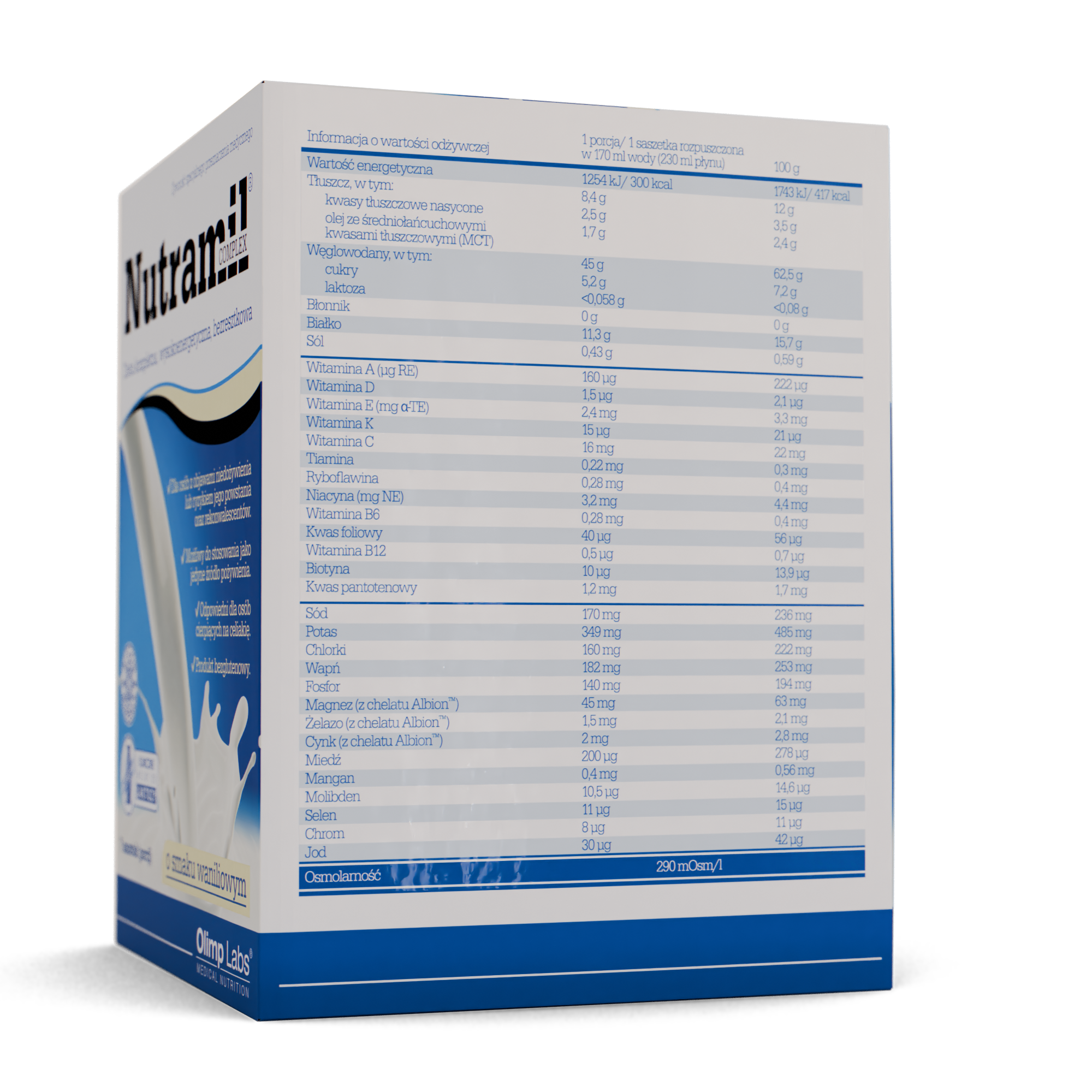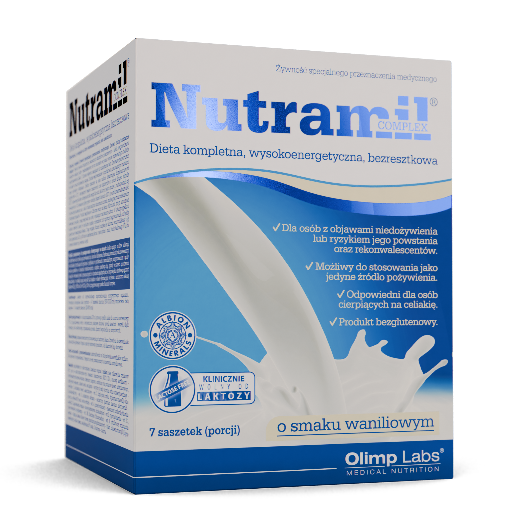 OLIMP NUTRAMIL COMPLEX Smak Waniliowy - 7 saszetek to specjalistyczny produkt żywieniowy przeznaczony do stosowania jako całkowite lub częściowe uzupełnienie diety. Produkt występuje w poręcznych saszetkach, co ułatwia dawkowanie i przygotowanie posiłku o stałej wartości odżywczej. Waniliowy smak sprawia, że jest on łatwo akceptowany, co jest istotne w dietach klinicznych wymagających codziennego stosowania.