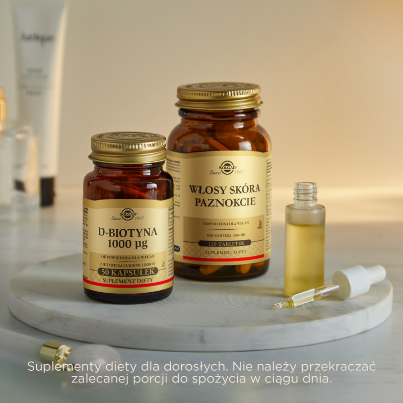 SOLGAR Włosy, Skóra, Paznokcie to sprawdzony suplement wspierający zdrowy wygląd włosów, skóry i paznokci, oparty na składnikach o potwierdzonym działaniu.
