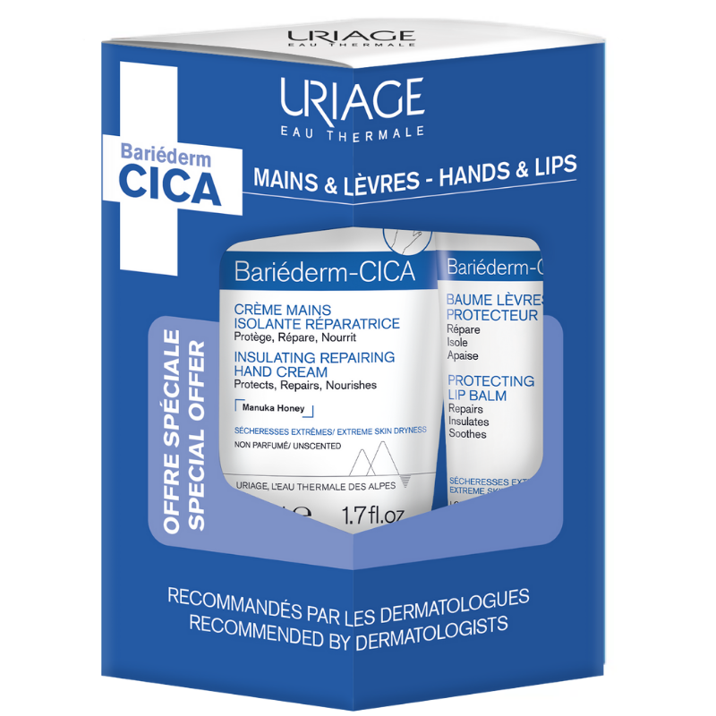 Zestaw Uriage Bariéderm CICA to kompleksowe wsparcie dla skóry narażonej na podrażnienia, przesuszenie i działanie czynników zewnętrznych. Połączenie regenerująco-ochronnego kremu do rąk oraz barierowego balsamu do ust zapewnia intensywną pielęgnację, ukojenie i długotrwałą ochronę nawet bardzo wrażliwej skóry.