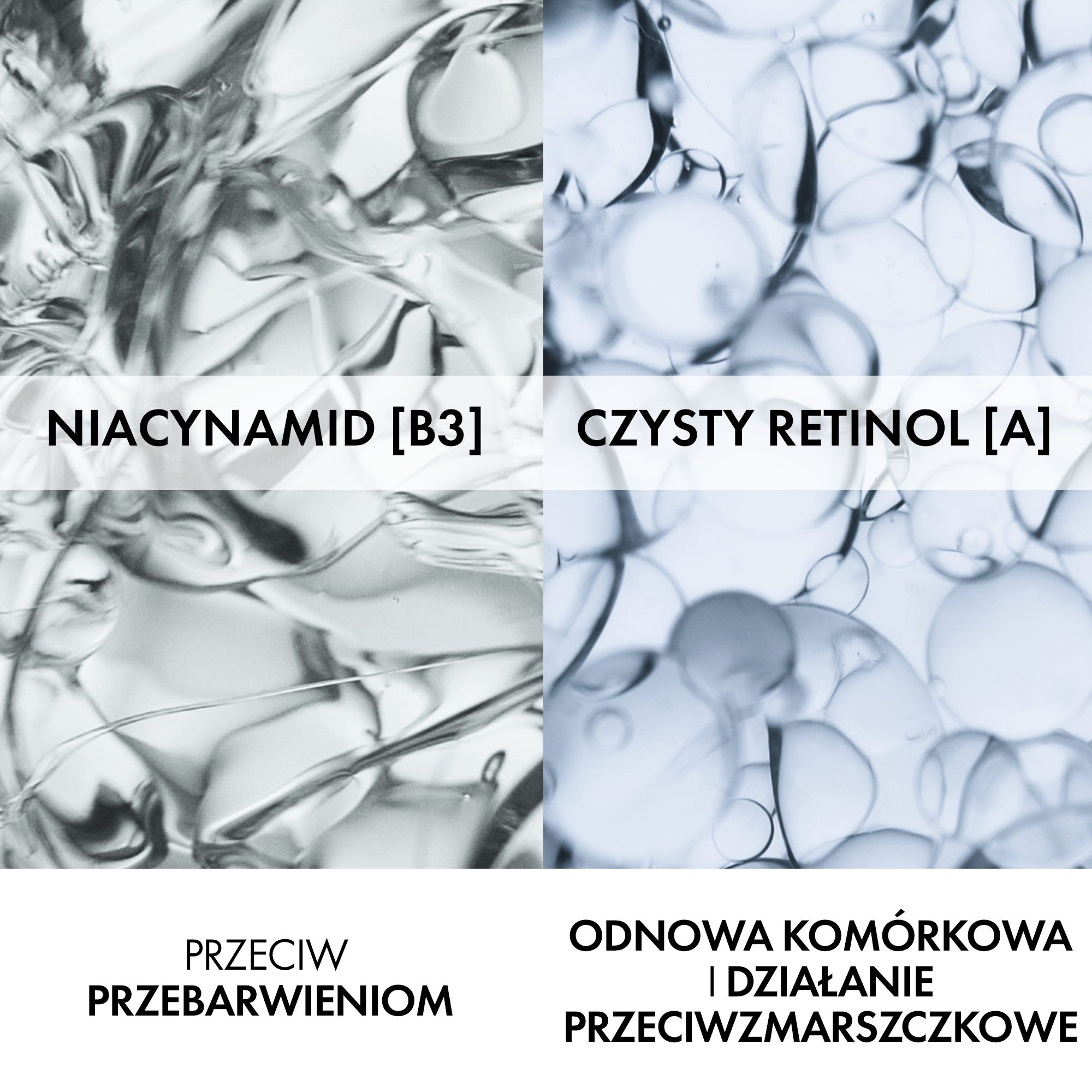 Vichy Liftactiv Krem przeciw przebarwieniom na noc, wzbogacony czystym retinolem i niacynamidem, to nowoczesny preparat łączący zaawansowaną pielęgnację z udowodnioną skutecznością. Dzięki innowacyjnej technologii, która łączy stabilną formę czystego retinolu z niacynamidem, ten krem wspiera odnowę komórkową skóry podczas snu. Redukuje widoczność przebarwień i zmarszczek, a już po pierwszej nocy skóra staje się zauważalnie gładka. Po tygodniu stosowania koloryt cery ulega poprawie. Regularne używanie kremu pozwala uzyskać efekty, które nie tylko poprawiają wygląd, ale także przywracają skórze świeżość i witalność.